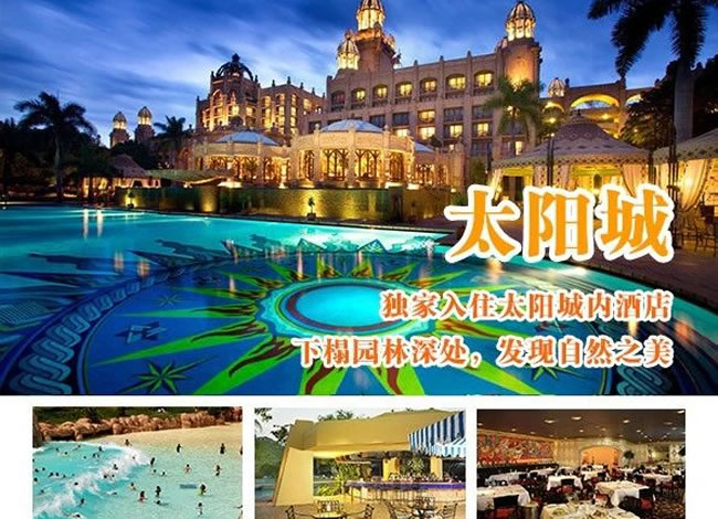 酒店早餐。前往機(jī)場(chǎng),搭乘航班飛往約堡。驅(qū)車前往南半球最大的娛樂(lè)中心-太陽(yáng)城。不曾身臨其境,便無(wú)法真正理解太陽(yáng)城給人所帶來(lái)的震撼。將古老傳說(shuō)的神秘滄桑、非洲大陸的野性粗獷和現(xiàn)代生活的便利舒適那樣完美地融合在一起。你可以在失落城探尋非洲大陸上最古老的秘密,根據(jù)神話傳說(shuō)興建的地震橋以及豪華賭場(chǎng)、著名的建筑-失落城等。這里有清幽的湖光山色,無(wú)數(shù)的珍禽異草,游人可漫步其中享受。(含自由活動(dòng)游覽時(shí)間約3小時(shí)) 晚餐后,入住太陽(yáng)城內(nèi)豪華酒店,您可于太陽(yáng)城內(nèi)賭場(chǎng)大顯身手。溫馨提示:約堡-太陽(yáng)城,約210公里,車程約3小時(shí)